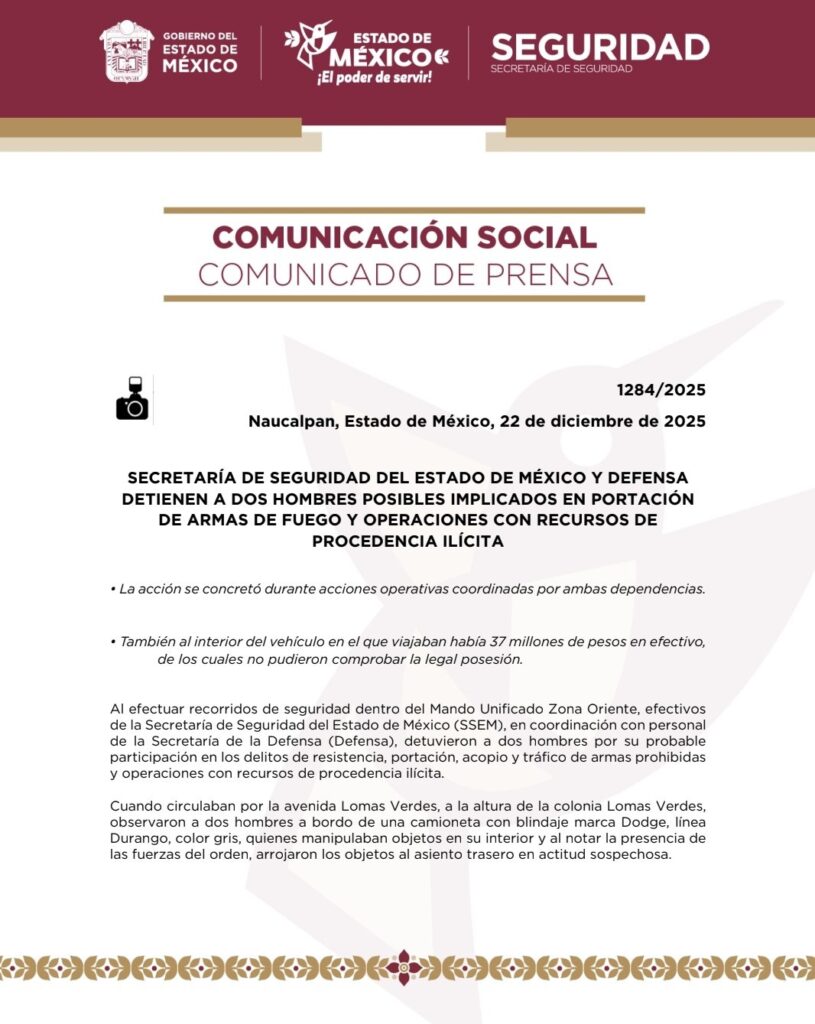 Naucalpan, Estado de México. – En un golpe contundente contra las operaciones con recursos de procedencia ilícita, elementos de la Secretaría de Seguridad del Estado de México (SSEM) en coordinación con la Defensa Nacional, lograron la detención de dos sujetos que transportaban una fortuna en efectivo sin poder acreditar su procedencia legal.
